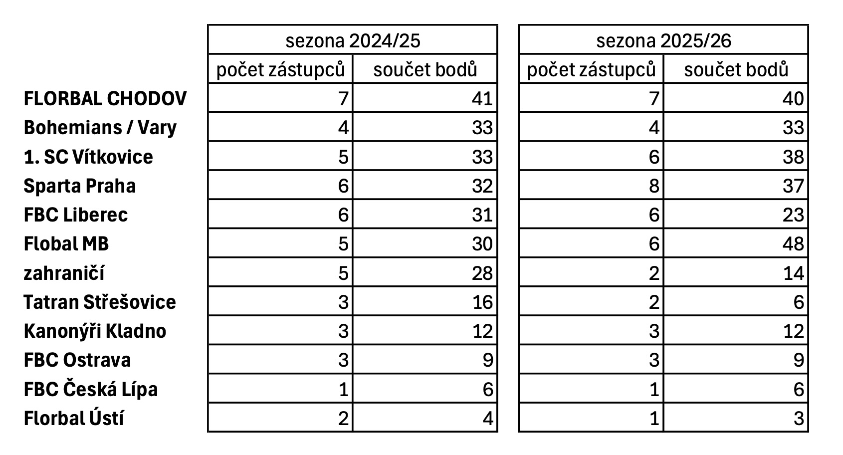 Králem letošních žebříčků (vycházeli jsme z toho, kde hráči strávili letošní sezonu) je asi trochu překvapivě Chodov, který měl v žebříčcích celkem 7 kmenových hráčů. Na prvním místě v počtu talentů tak Chodov vystřídal Tatran. Ten měl minulém ročníku v žebříčcích také 7 hráčů, letos klesl na 4. Na druhém místě se umístili Liberec se Spartou. Ti měli v žebříčcích celkem 6 zástupců. V závěsu jsou Vítkovice a Boleslav, kteří měli v žebříčcích 5 zástupců.
