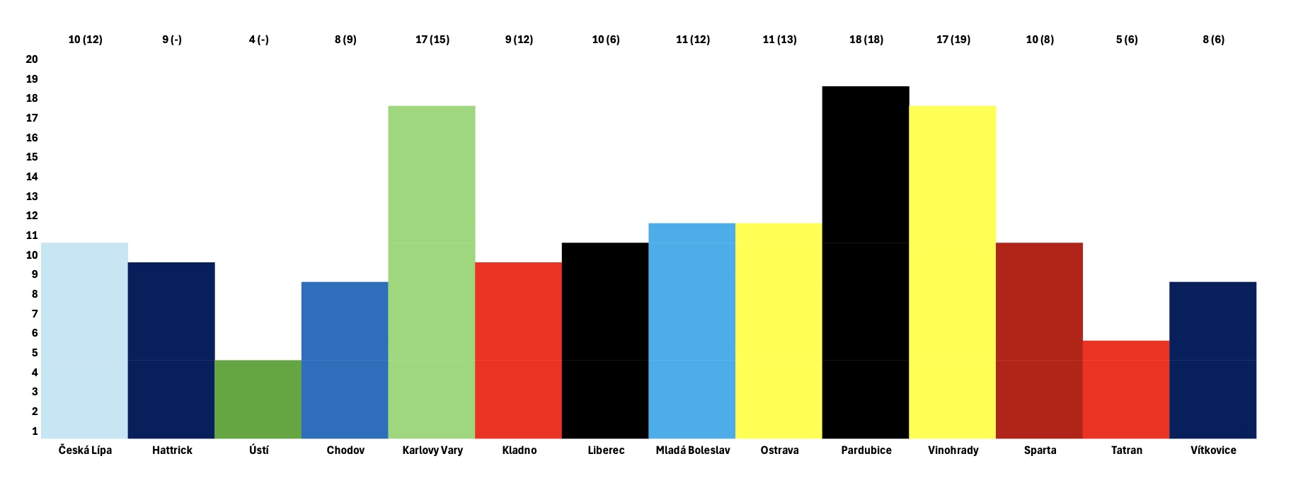 O úroveň níže se pohybuje trio Mladá Boleslav, FBC Ostrava a Česká Lípa, kde je počet hráčů přivedených v mužské kategorii kolem deseti. Všechny ostatní kluby se již pohybují pod touto hranicí a úplně nejméně čárek v této statistice mají aktuálně Tatran (5) a Ústí (4).